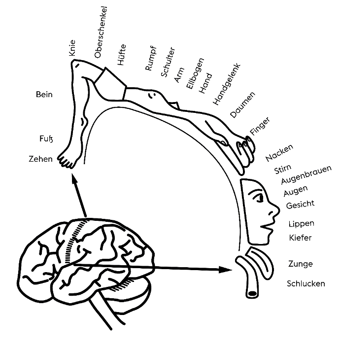 Auf der Oberfläche deines Gehirns gibt es eine Landkarte deines Körpers. Genauso wie beim Homunkulus, nehmen empfindliche Stellen wie deine Finger viel mehr Platz in deinem Gehirn ein, als weniger empfindliche Teile wie dein Rücken. Je empfindlicher ein Körperteil ist, desto mehr Platz braucht es im Gehirn, um alle Empfindungen zu verarbeiten.