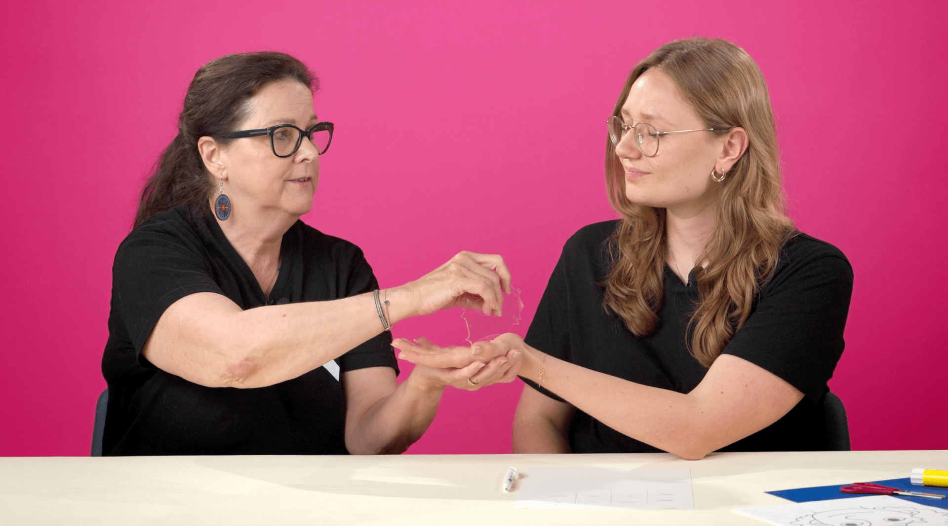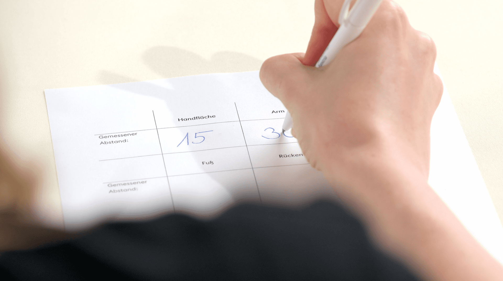 Bitte deine Testperson, die Augen zu schließen und bitte sie, dir die Handfläche auszustrecken. Drücke das Messkärtchen mit dem größten Abstand (60 mm) ganz leicht auf die Handfläche. Frage dann, ob deine Testperson eine oder zwei Berührungen spürt.