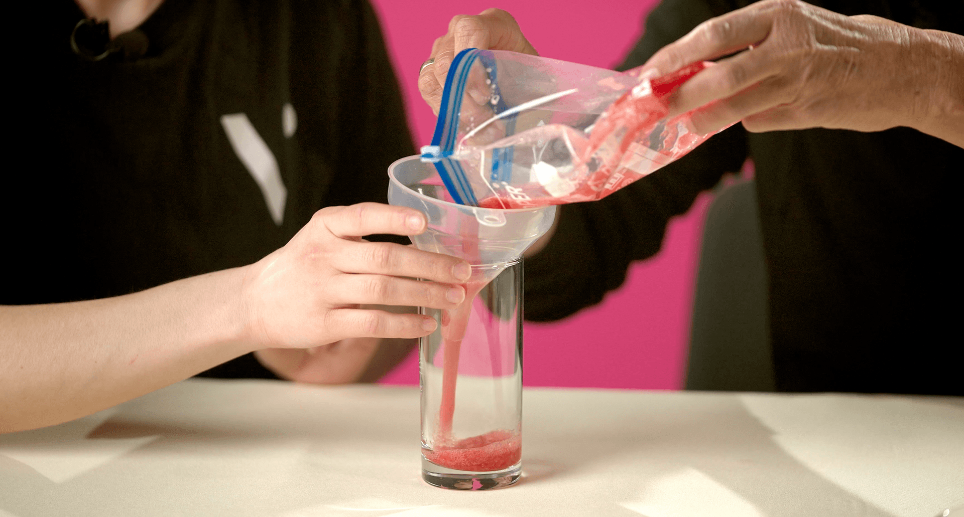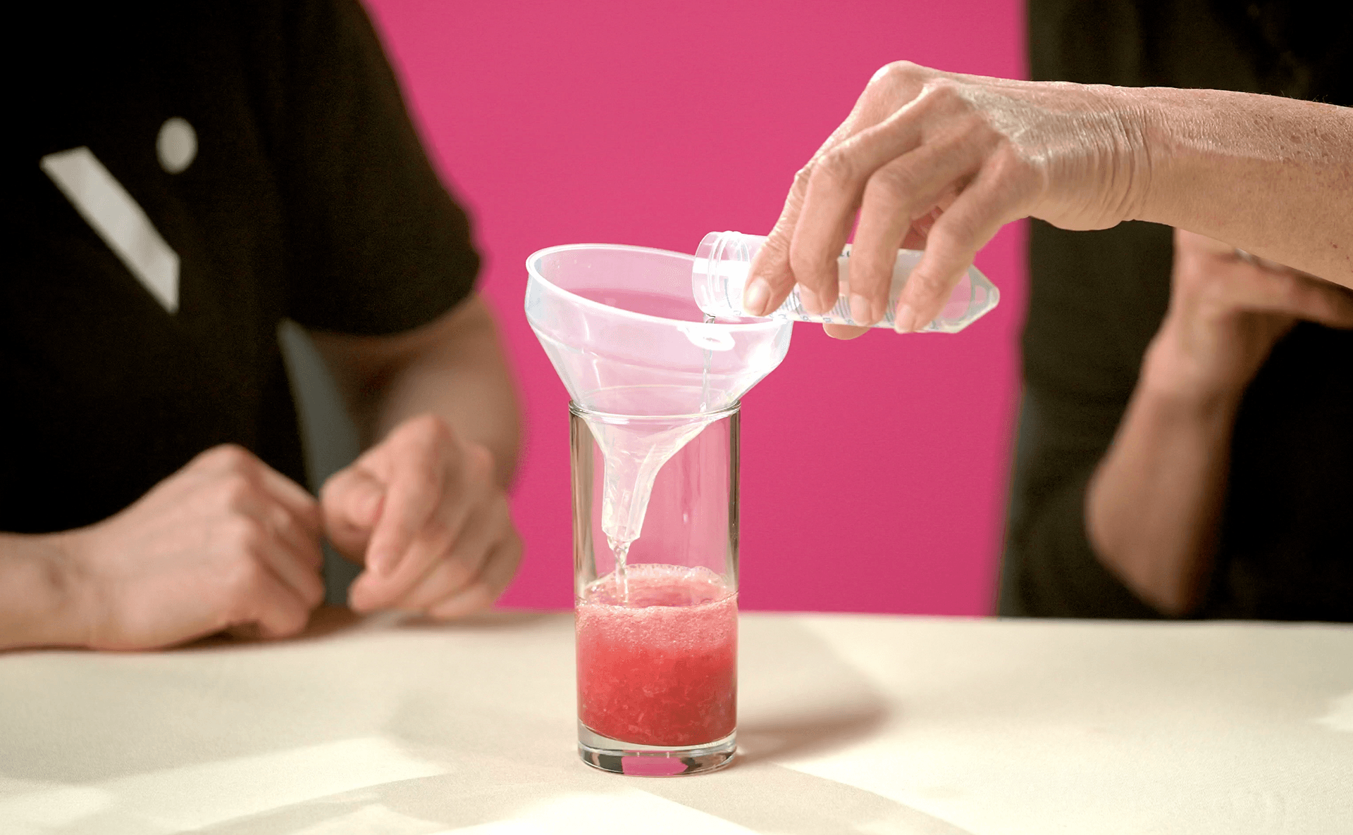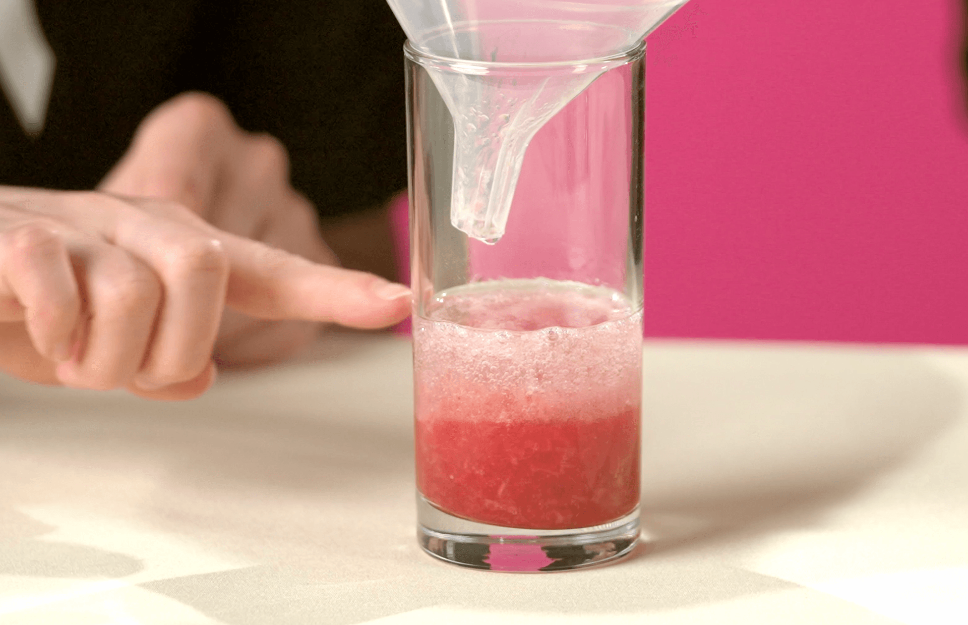 When you can no longer feel any strawberry pieces, pour the mixture into your glass using the funnel.