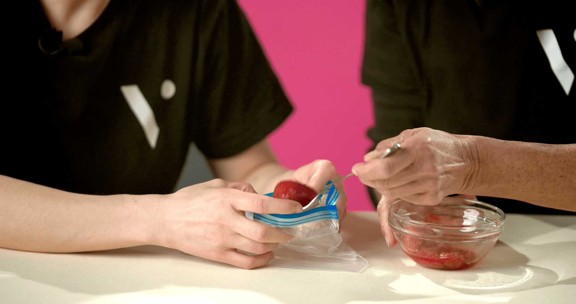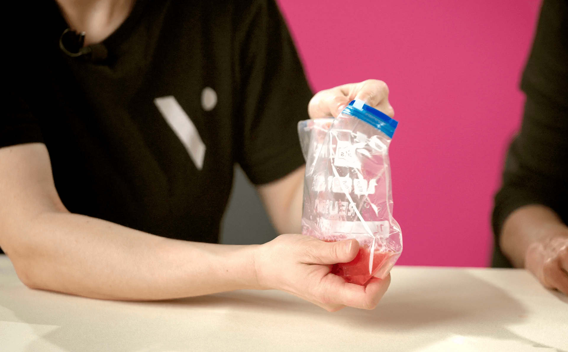 Put a large strawberry, half a glass of water, and a splash of dish soap into your plastic bag.