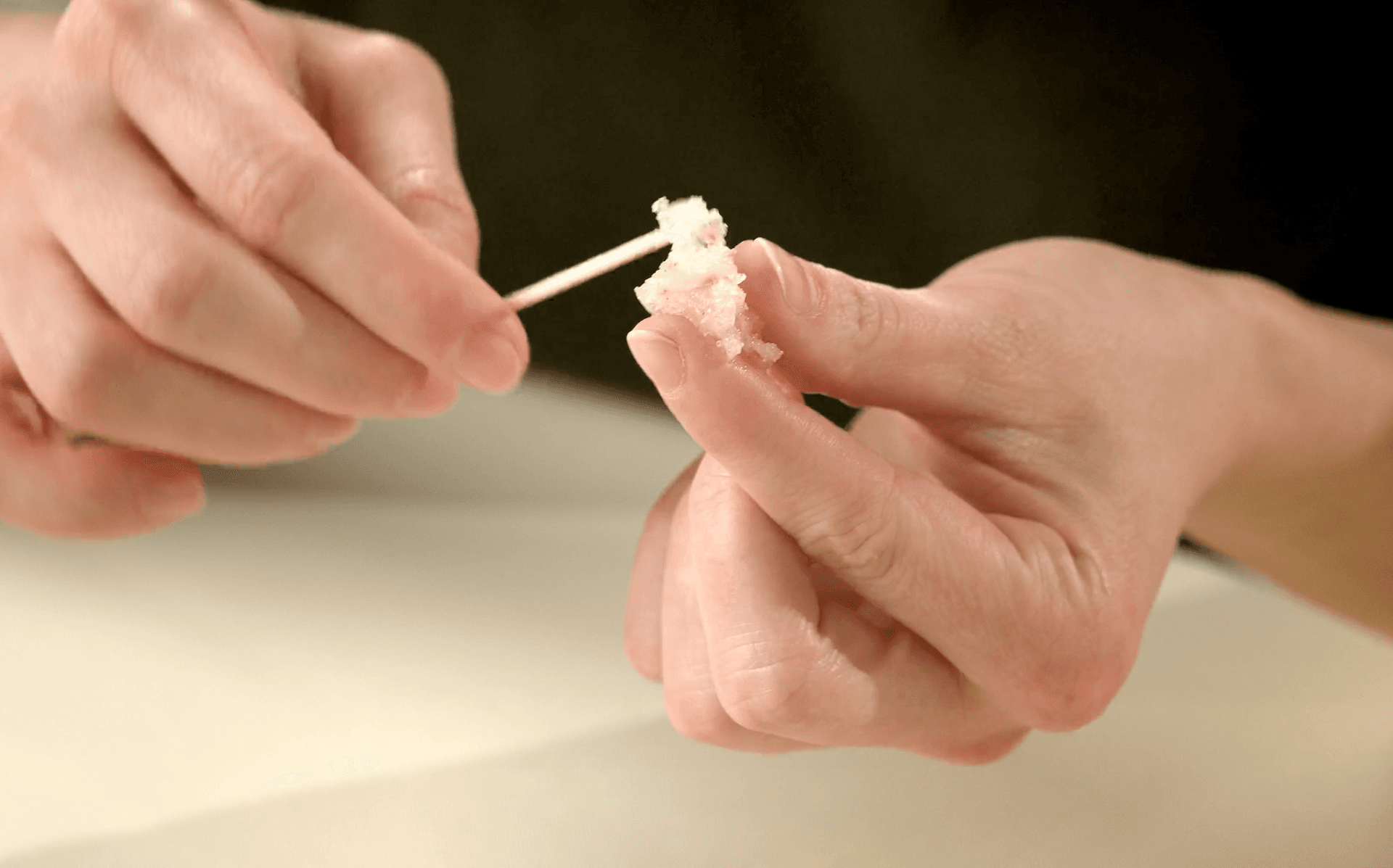 If white threads have formed at the top of the liquid, remove them with a toothpick to examine them more closely and touch them (wash your hands thoroughly afterwards).