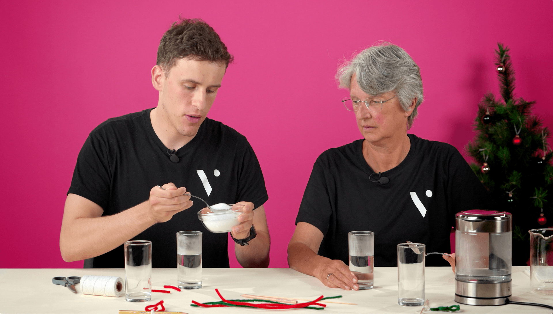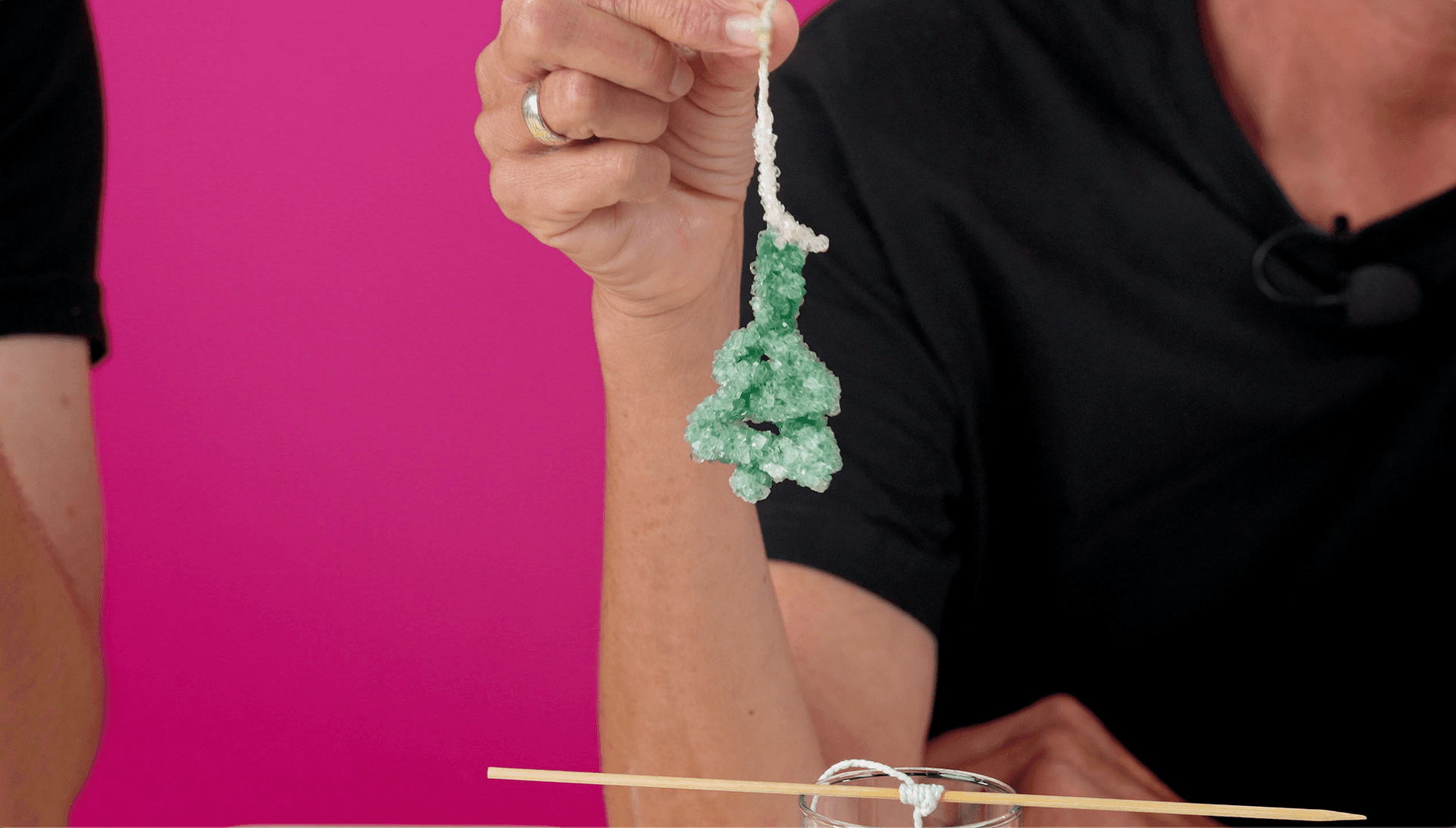 Crystals form when solid substances dissolve in a liquid and then arrange themselves in very regular shapes. In our case, the solid substance is alum, a salt that you can buy in pharmacies or online. When you add alum to hot water, it dissolves. As the water cools, the water can no longer hold as much salt, so the salt "grows", forming sparkling crystals! These grow particularly well on rough surfaces, such as a pipe cleaner.